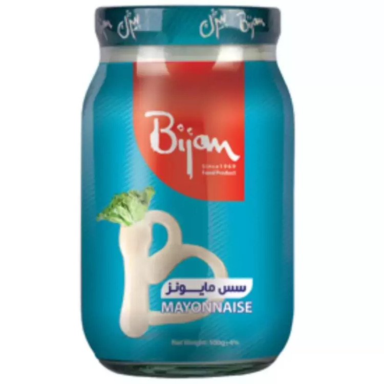 سس مایونز شیشه ای 460 گرمی بیژن.محصول ایران محتویات:روغن مایع نباتی،سرکه،شکر،نمک تصفیه شده،پودر زرده تخم مرغ،اسید لاکتیک،پودر خردل، پایدارکننده،نشاسته اصلاح شده،اسید سیتریک،بنزوات سدیم و سوربات پتاسیم،اسانس لیمو،آب در دمای یخچال نگهداری شود.
